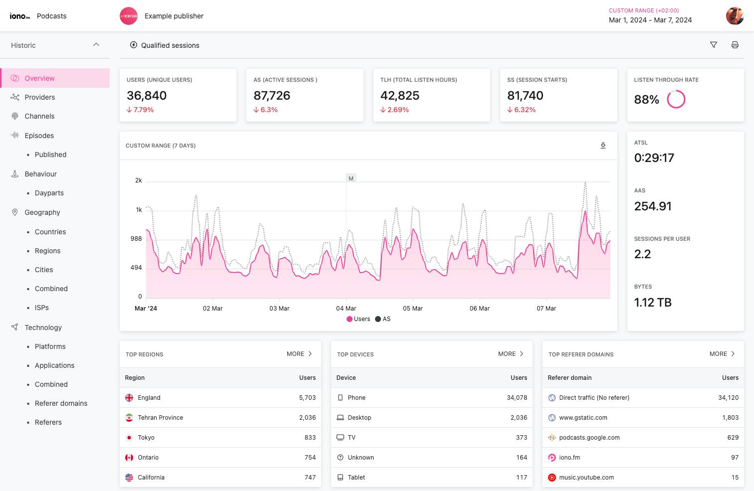 Our analytics dashboard offers a wide range of reporting features to help you gain even better insight in to your listeners and content.